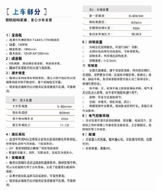 提高結構件強度、加快傳動部件效率、高效節(jié)能液壓系統(tǒng)可靠性高。 主卷揚提升機構采用機械傳動,行走、回轉、變幅及履帶伸縮采用液壓傳動。